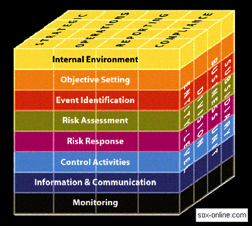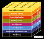 Exista o Relatia directa intre obiective (ceea ce o firma isi propune sa realizeze) si componente managementului riscurilor (ceea ce este necesar pentru atingerea acestor obiective). Aceasta relatie este reprezentata prin intermediul unui cub tri-dimensional care este simbolul vizual al COSO.