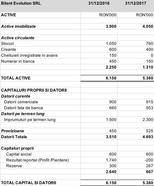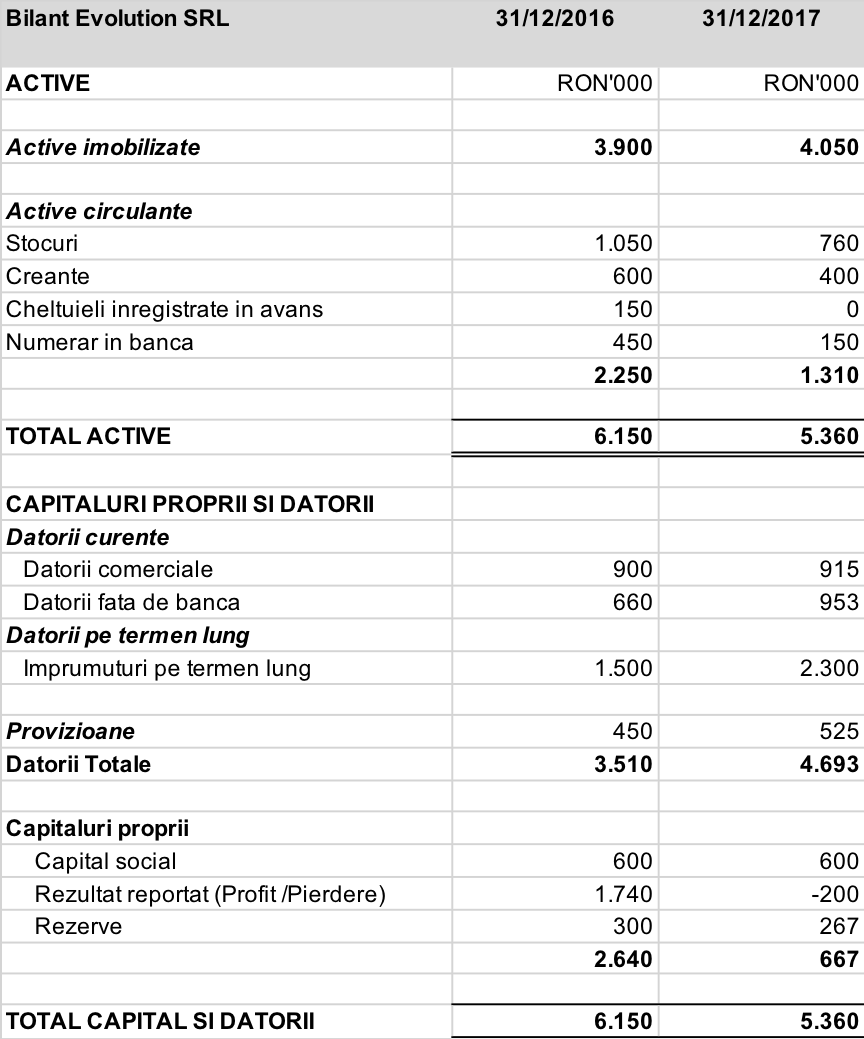 Spre exemplul in cazul bilantului firmei Evolution pentru anul 2017 ca urmare a inregistrarii unei pierderi de 200 Mii Lei capitalurile proprii au scazut semnificativ.