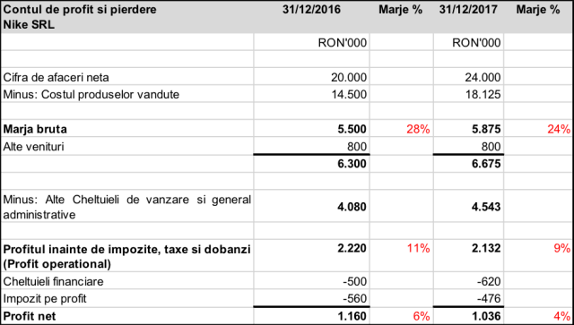 In exemplul nostru firma Nike are o marja operationala in 2017 de 9% in scadere de la 11% anul trecut. Scaderea marjei este cauzata de scaderea marjei comerciale ca urmare a cresterii costului produselor vandute.