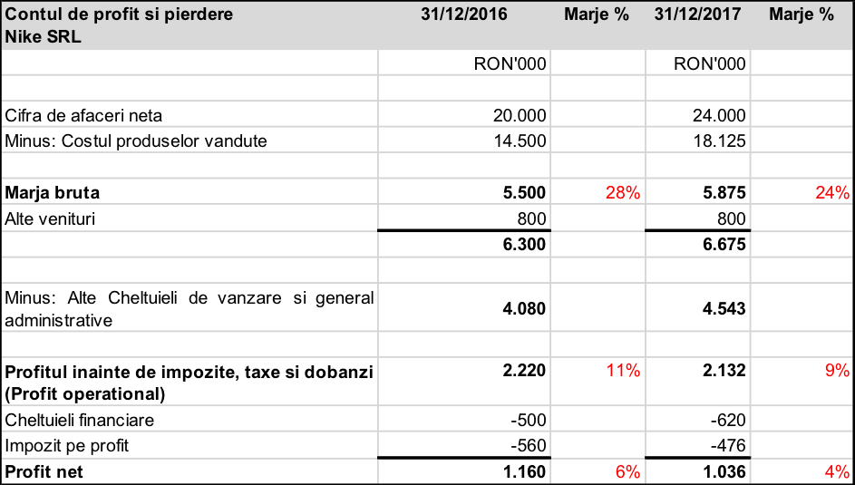 In exemplul nostru firma Nike are o marja comerciala in 2017 de 24% in scadere de la 28% anul trecut. Aceasta scadere este cauzata de cresterea costului produselor vandute intr-o proportie mai mare decat cresterea vanzarilor (cifra de afaceri)