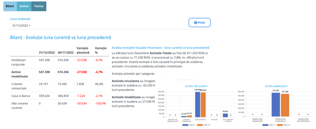 • Analiza Bilant: monitorizezi lunar evolutia activelor, datoriilor si capitalurilor proprii vs. luna precedenta.