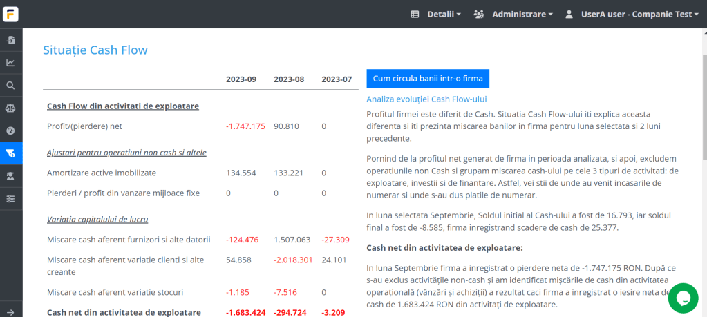 • Analiza Cash Flow: Controlezi si optimizezi Cash Flow-ul firmei. Intelegi diferenta dintre profitul si numerarul firmei si vizualizezi miscarea banilor in firma.