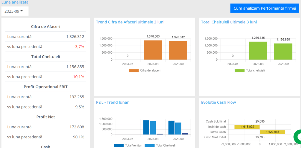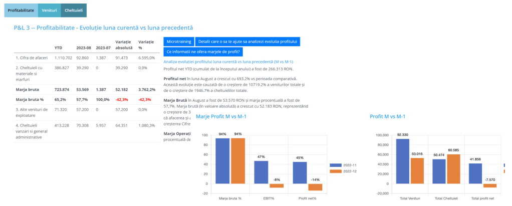 • Dashboard si Analiza Profitului: iti ofera o imagine de ansamblu rapida asupra evolutiei performantei financiare.