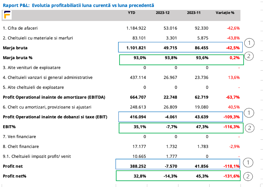 In raportul P&L (Profit si Pierdere) de mai jos sunt evidentiate cu 1 marjele de profitabilitate in valoare absoluta si cu 2 marjele de profitabilitate in valoare procentuala.